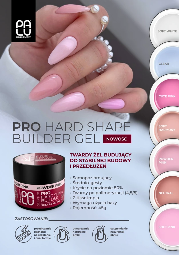 Żel Pro Hard Shape występuje w 7 kolorach: CLEAR – przezroczysty; SOFT WHITE - delikatny odcień mlecznej bieli, doskonały do stylizacji princess nails; SOFT PINK - subtelny róż, najjaśniejszy z całej palety, idealny do stylizacji princess nails; POWDER PINK - bardzo kobiecy, subtelny różowy odcień; CUTE PINK – słodki, świeży odcień różu; SOFT HARMONY - delikatnie brzoskwiniowy odcień beżu; NEUTRAL - neutralny, dopasowany do naturalnego koloru skóry.